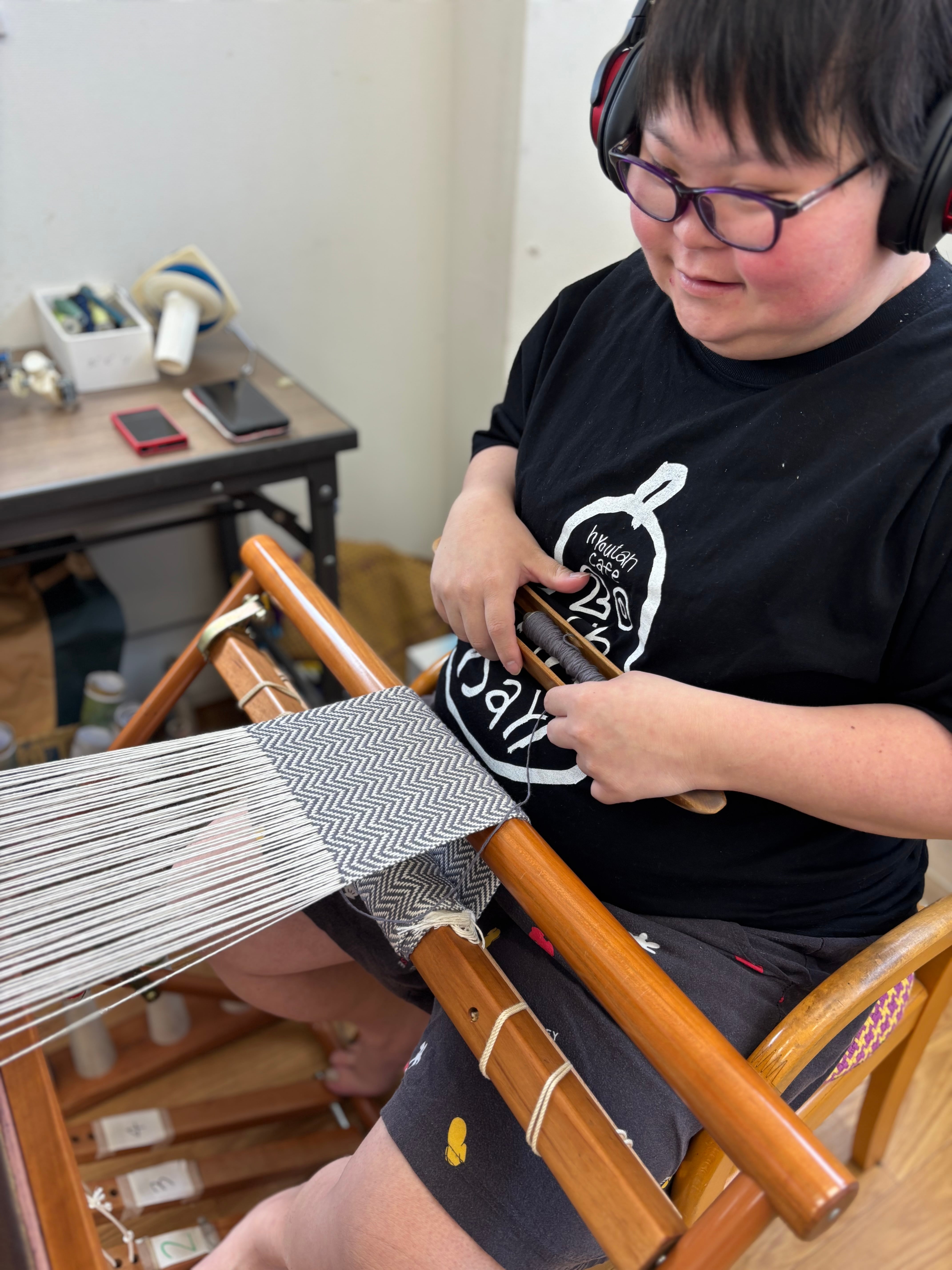こちらは複雑な4枚線稿の織機に挑戦したありささんのヘリボーン織を用いました。