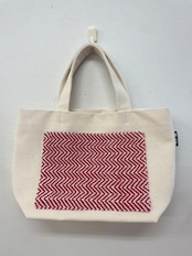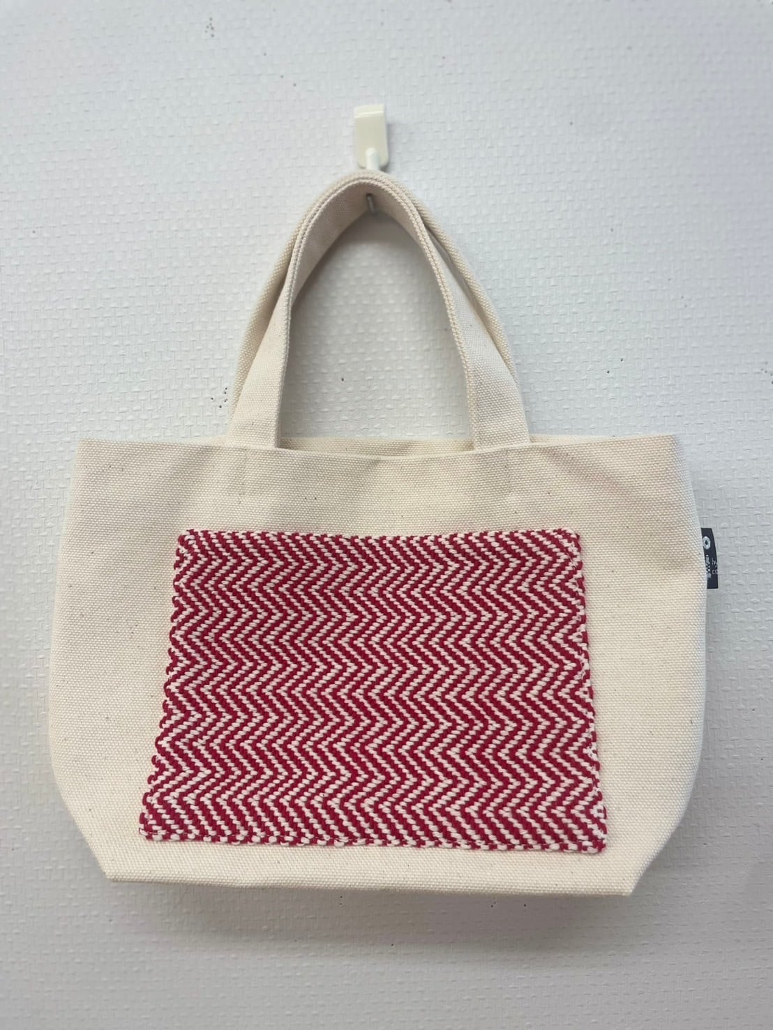 ひょうたんカフェの手織り生地を大きなポケットにして帆布のバッグに付けました。