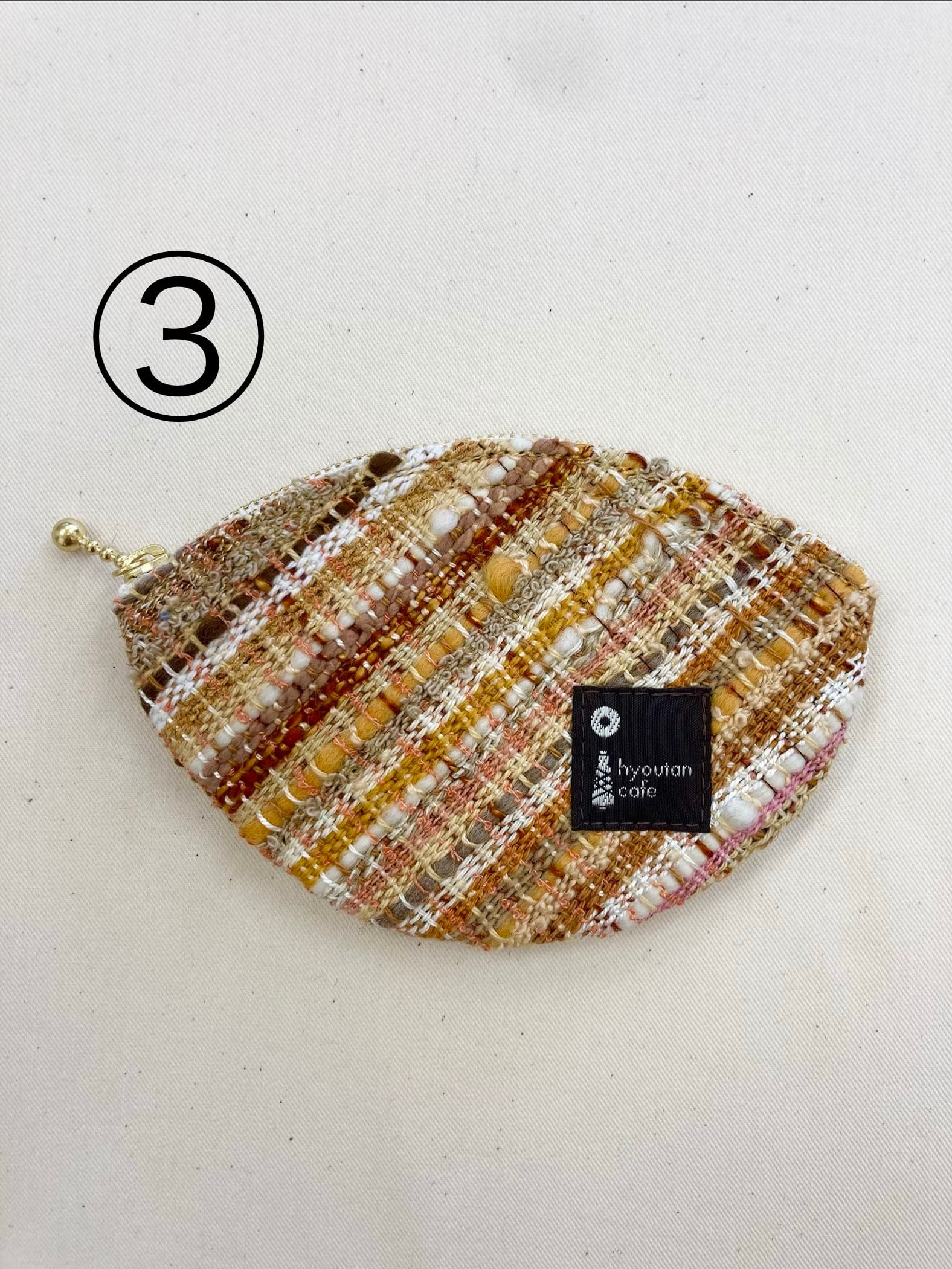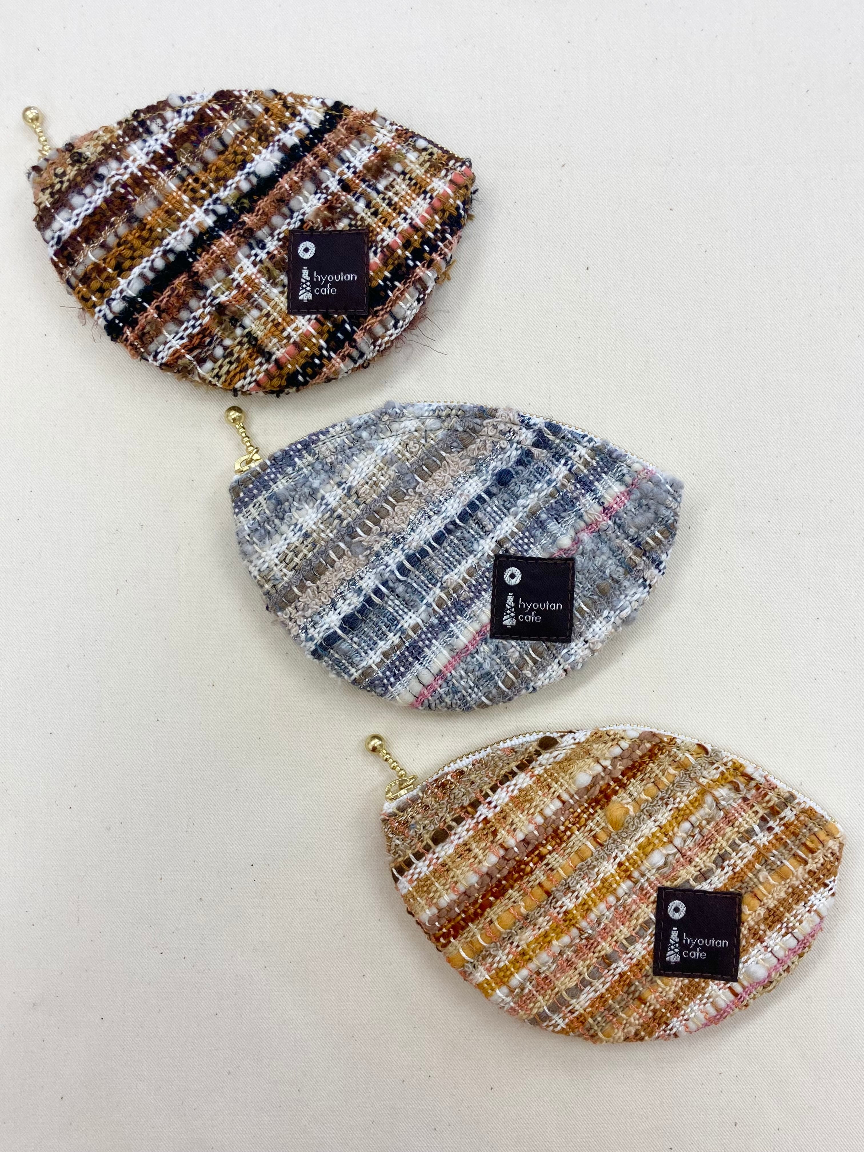 ①「三毛猫」②「グレートラ猫」③「トラ猫」をそれぞれイメージした3種類の織のリーフポーチです。