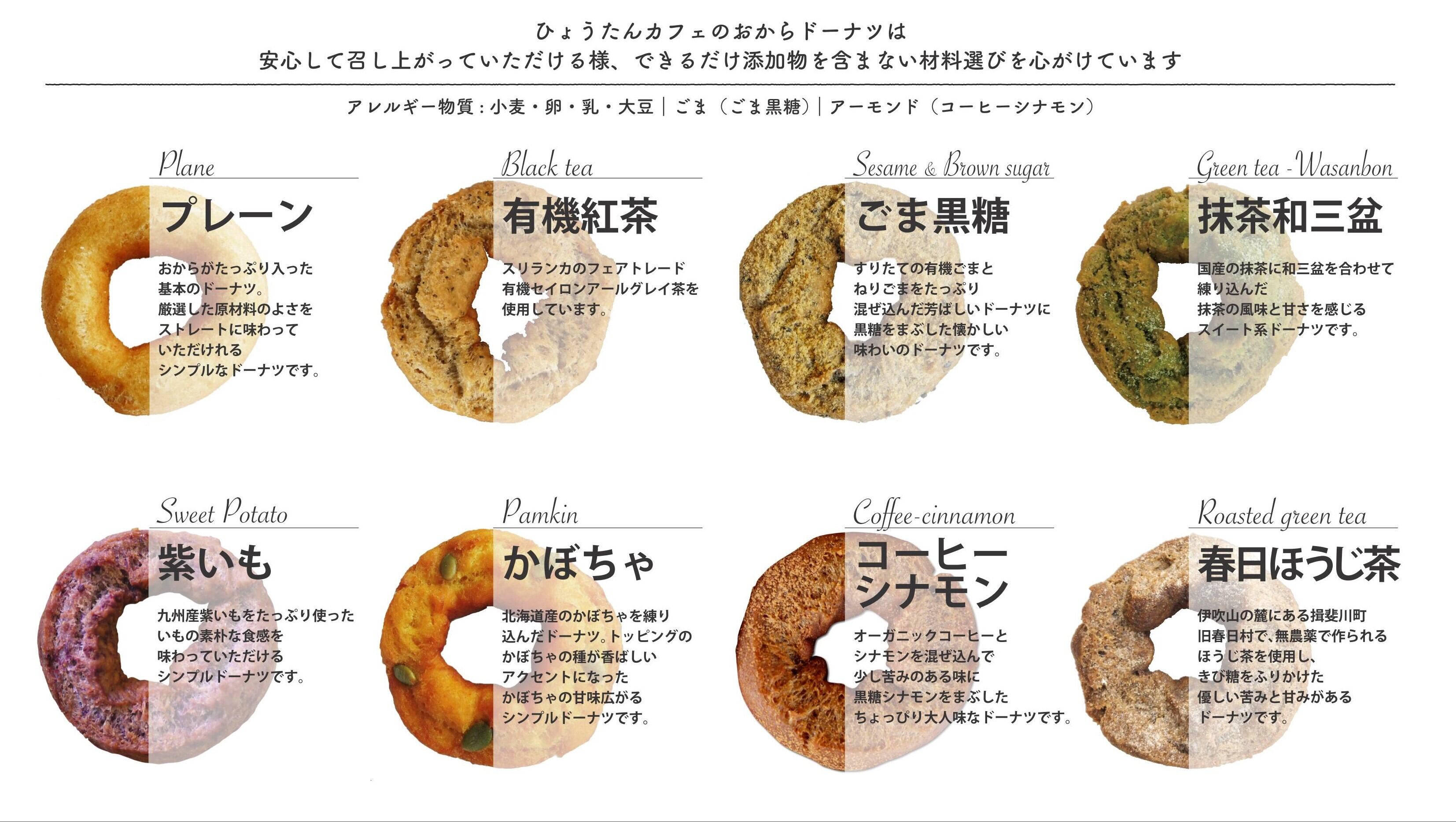 ※プレーン、ごま、紫いも、かぼちゃ、有機紅茶、コーヒー、抹茶、ほうじ茶 を各1個8種類お届けします。